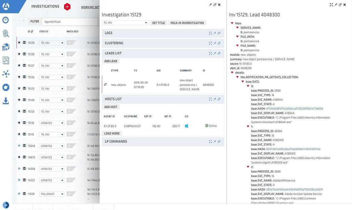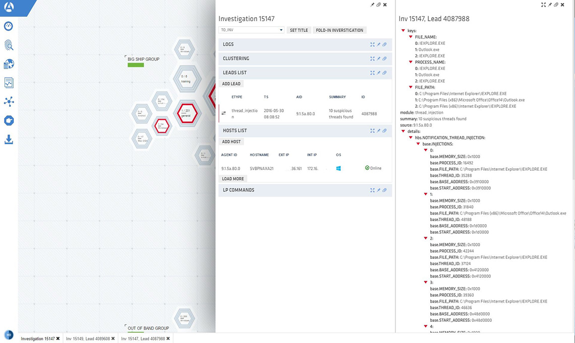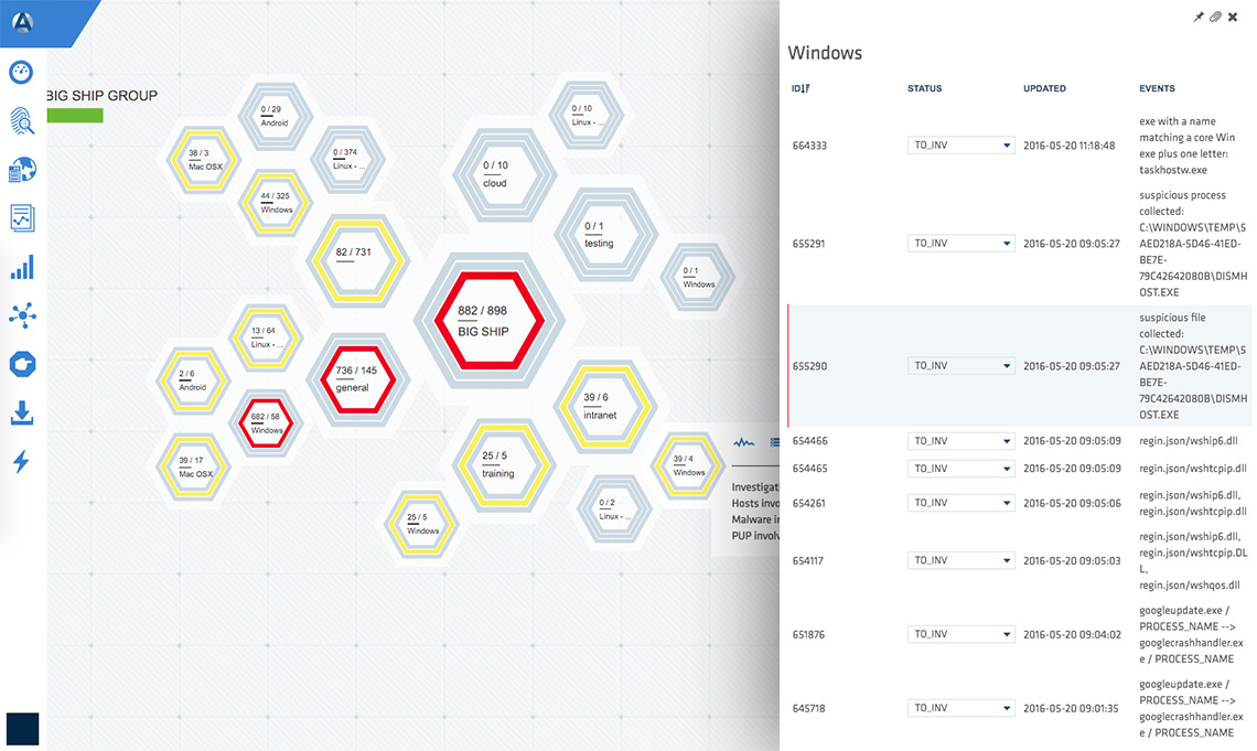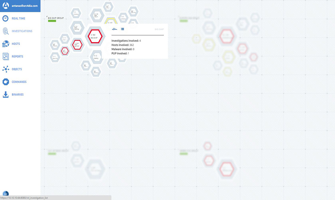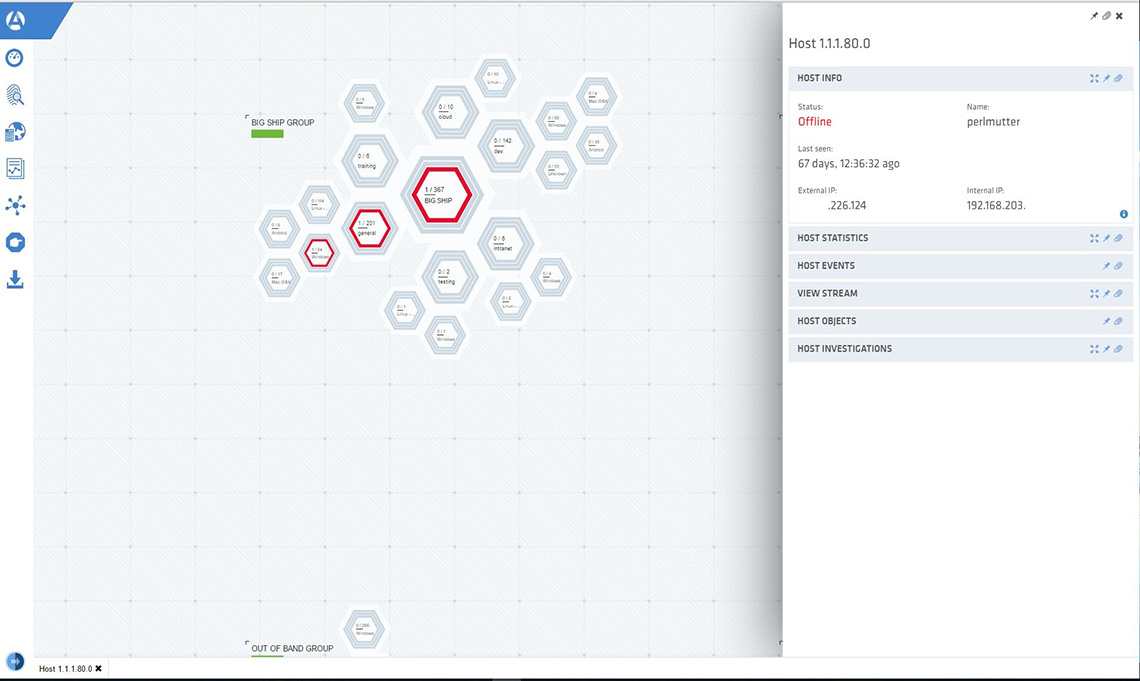 Track system activity in real time: view the number of threats detected, investigations created, and hosts activated. Users can create custom logic maps of critical infrastructure, important areas of their network, or specific hosts.